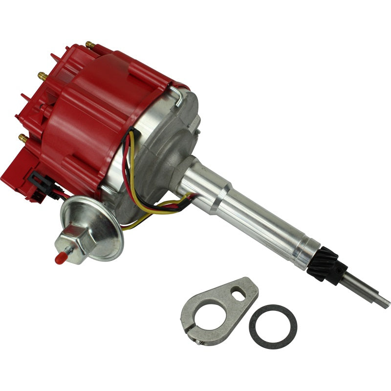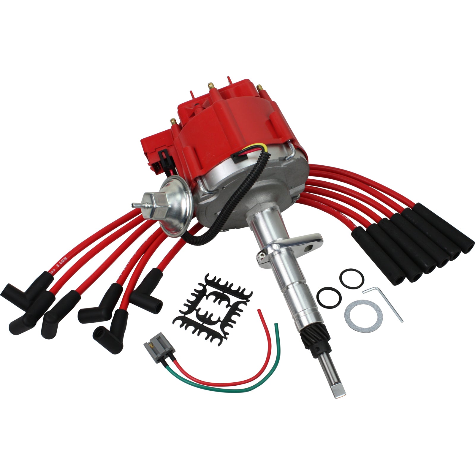 •FEATURES All-in-One HEI design, CNC machined aluminum for exact fit highly durable non-corrosive housings, simple 1-Wire Hook-up, adjustable vacuum and mechanical (extra bushings not included) advance, welded weight pins, hardened steel shaft, Brass terminals, high output 65kV ignition coil, precision molded thermoplastic to resist fracturing and cracking from constant heat cycling, low Ohm spark plug wires, extra tight plug wire boot fitment, all connections are watertight and weatherproof, tested and ensured to match OE fit, only performance grade materials used for long service life.