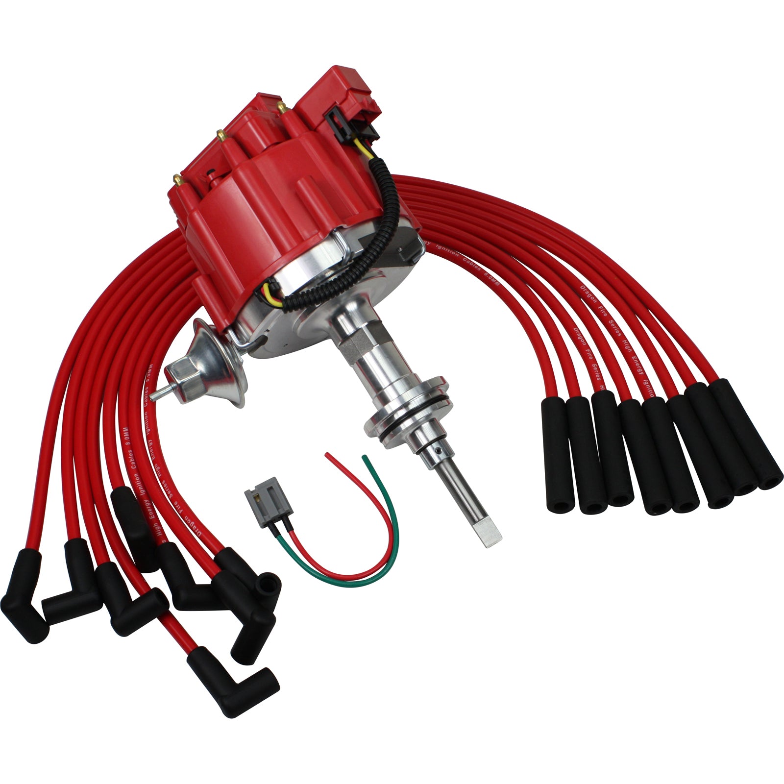 •FEATURES All-in-One HEI design, CNC machined aluminum for exact fit highly durable non-corrosive housings, simple 1-Wire Hook-up, adjustable vacuum and mechanical (extra bushings not included) advance, welded weight pins, hardened steel shaft, Brass terminals, high output 65kV ignition coil, precision molded thermoplastic to resist fracturing and cracking from constant heat cycling, low Ohm spark plug wires, extra tight plug wire boot fitment, all connections are watertight and weatherproof, tested and ensured to match OE fit, only performance grade materials used for long service life.