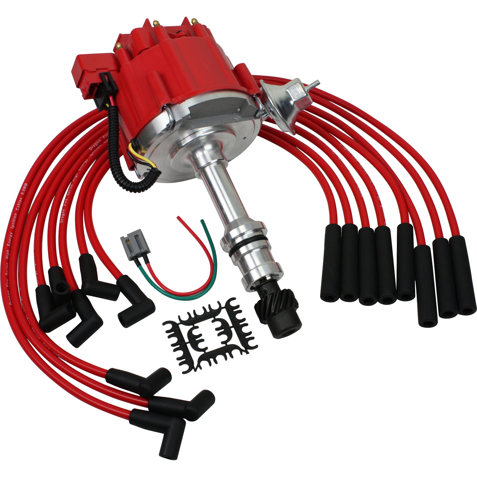 •FEATURES All-in-One HEI design, CNC machined aluminum for exact fit highly durable non-corrosive housings, simple 1-Wire Hook-up, adjustable vacuum and mechanical (extra bushings not included) advance, welded weight pins, hardened steel shaft, Brass terminals, high output 65kV ignition coil, precision molded thermoplastic to resist fracturing and cracking from constant heat cycling, low Ohm spark plug wires, extra tight plug wire boot fitment, all connections are watertight and weatherproof, tested and ensured to match OE fit, only performance grade materials used for long service life.