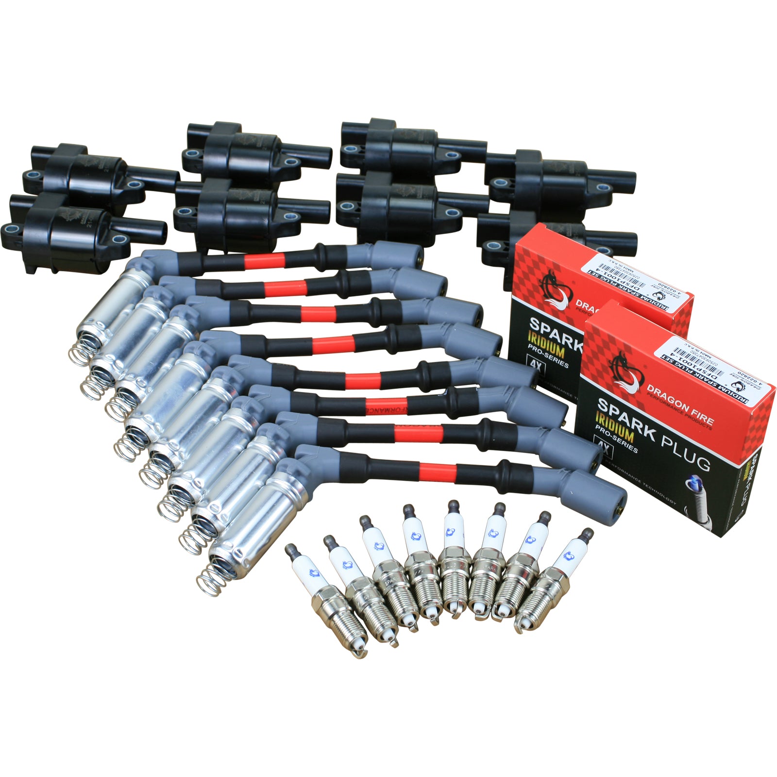 Dragon Fire Performance Tune Up Set Complete With Round Ignition Coils Spark Plugs Spark Plug Wires For 2005-2017 Chevy GM 4.8L 5.3L 6.0L 6.2L 6.6L V8