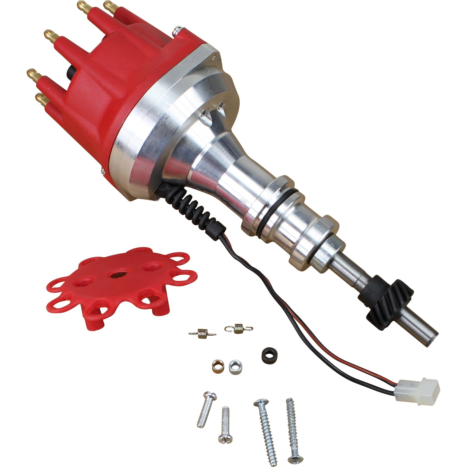 Dragon Fire Performance Ready to Run ignition distributor kits are all about durability and performance. Simply the best choice over higher priced ignition systems and cheap Chinese knockoffs. Dragon Fire Performance ignition distributors use only high-quality components to create long-lasting, reliable ignition systems. They allow you to keep the OE look with a small cap and gain all the benefits of an electronic ignition. All Dragon Fire Performance Ready to Run ignition distributors utilize a CNC machined aluminum housing for an exact OEM fit and corrosion protection. Distributor features include .50" drive shaft, heavy duty upper bearing, harden steel internals, Dragon Fire Performance electronics, adjustable mechanical advance (bushings included), and Brass terminals. Simple two wire connection to coil and chassis ground (CDI Included) for a quick install. Comes complete with Dragon fire's high performance 48,000 Volt remote mount ignition coil (peak current of 260 mA) and low Ohm spark plug wires. Featuring a Kevlar® core with a low resistance spiral wound alloy conductor, tightly wrapped for maximum spark energy transmission up to 80,000 VAC, RFI/EMI Suppression, and extra thick silicone and EPDM insulation sleeve for superior protection against voltage leaks and engine heat. Terminals are protected by extra thick high-temp silicone boots to ensure optimal spark delivery and extended service life. Heat Rated to 600° F. Includes installation guide for an easy DIY install. Making it easier than ever to upgrade your old worn-out points distributor to a new performance electronic ignition. Comes Complete as pictured. *See Fitment Guide and part number to confirm this is the correct part before purchase.*