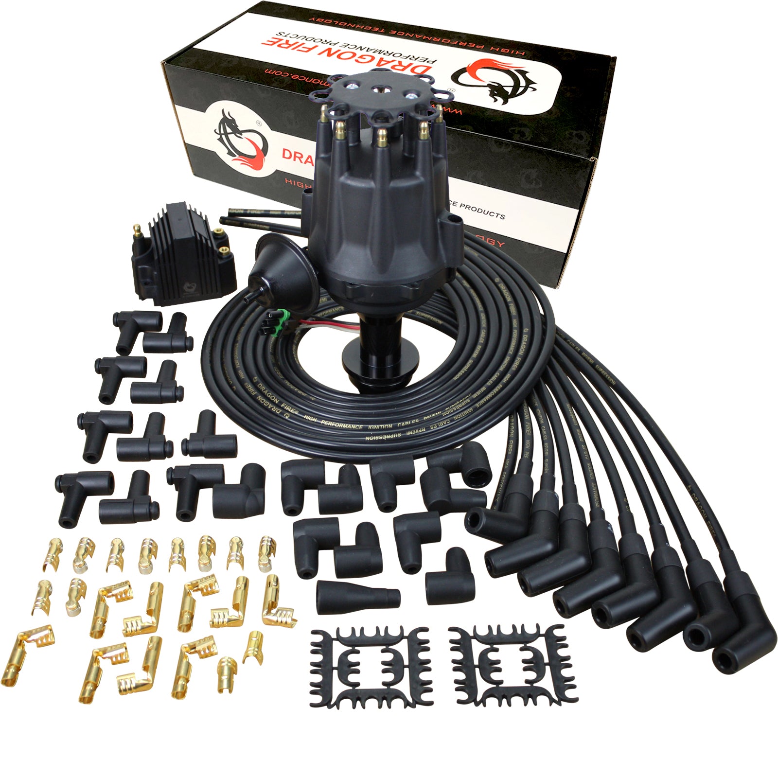 Dragon Fire Performance Pro Series ignition distributor kits are all about durability and performance. Simply the best choice over higher priced ignition systems and cheap Chinese knockoffs. Dragon Fire Performance ignition distributors use only high-quality components to create long-lasting, reliable ignition systems. They allow you to keep the OE look with a small cap and gain all the benefits of an electronic ignition. All Dragon Fire Performance Pro Series ignition distributors utilize a CNC machined aluminum housing for an exact OEM fit and corrosion protection. Distributor features include .50” drive shaft, heavy duty upper bearing, harden steel internals, Dragon Fire Performance electronics, adjustable mechanical advance (bushings included), and Brass terminals. Simple three wire connection to Coil and Chassis Ground (CDI box NOT required) for a quick install. Comes complete with Dragon fire’s high performance 48,000 Volt remount mount ignition coil (peak current of 260 mA) and low Ohm Street Series custom cut-to fit spark plug wire set, featuring a Kevlar® core, low resistance spiral wound alloy conductor, RFI/EMI Suppression, and extra thick silicone and EPDM insulation sleeve for superior protection against voltage leaks and engine heat. Terminals are protected by extra thick high-temp silicone boots to ensure optimal spark delivery and extended service life. Heat Rated to 600° F and Rated good up to 80,000 Volts. Includes installation guide for an easy DIY install. Making it easier than ever to upgrade your old worn out points distributor to a new performance electronic ignition. *See Fitment Guide and part number to confirm this is the correct part before purchase.*