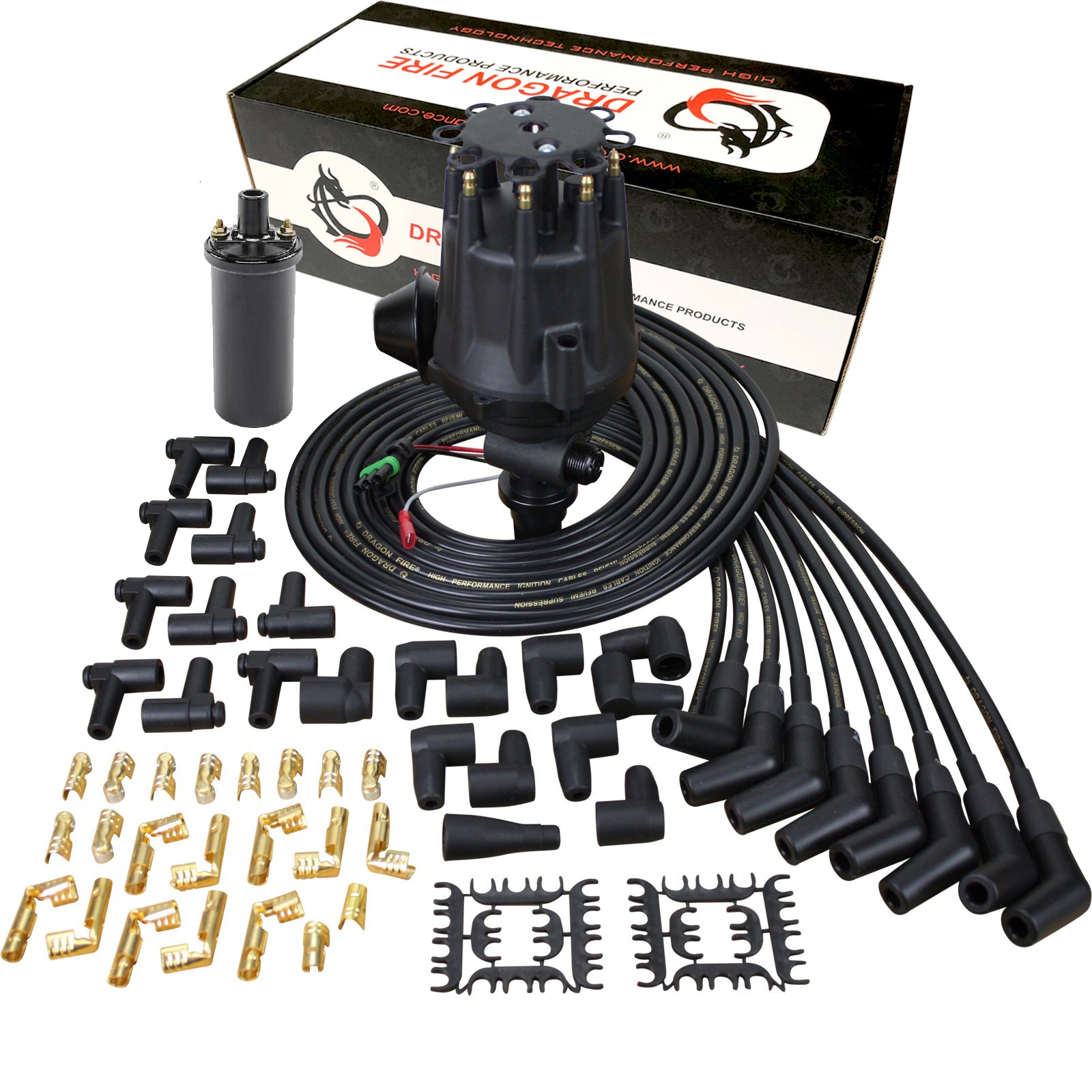 Dragon Fire Performance Pro Series Ready To Run Ignition Distributor Coil and 135° Spark Plug Wire Set For Chevy 327 350 427 454 With Tach Drive V8