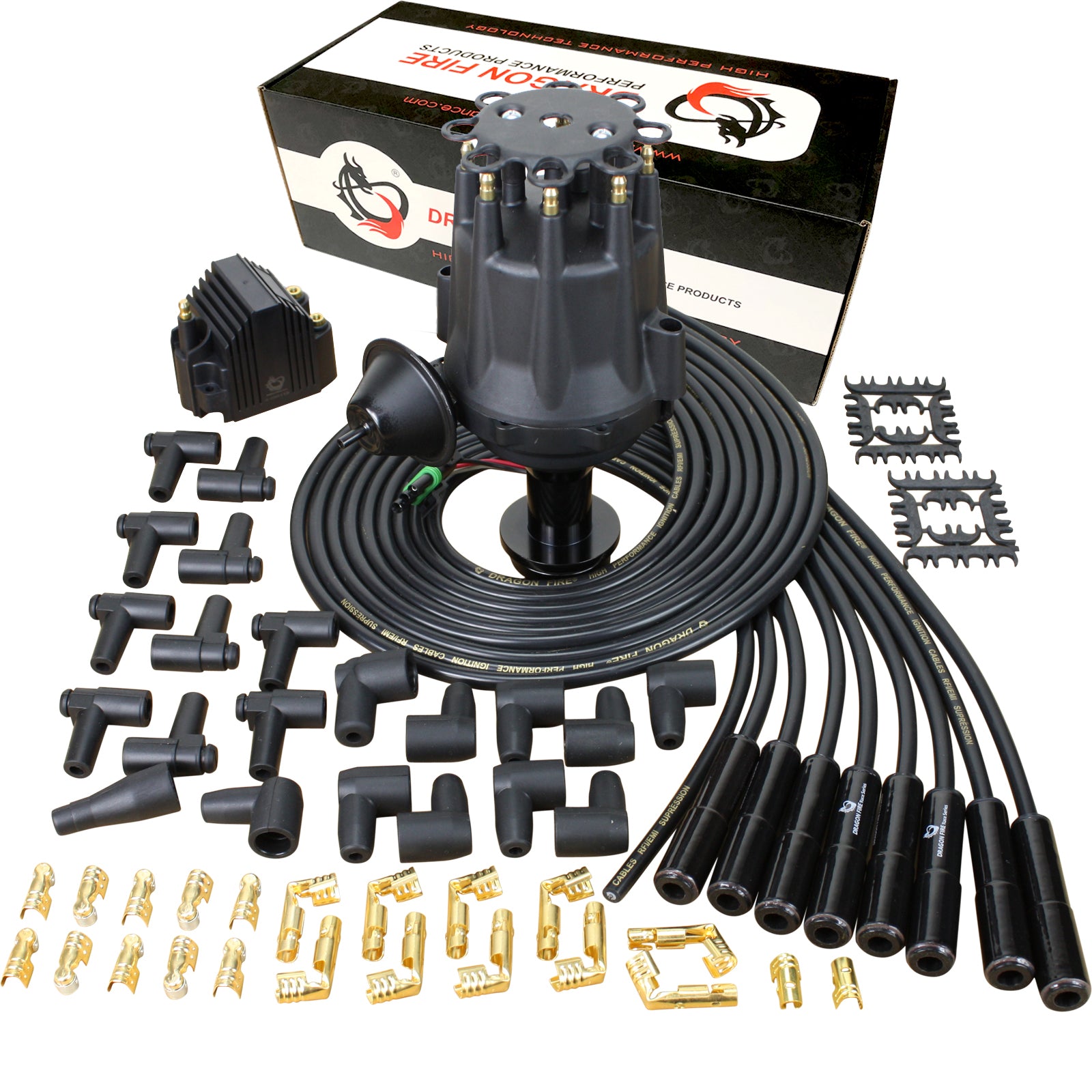 Dragon Fire Performance Pro Series Ready To Run Ignition Distributor Coil and 180° Ceramic Spark Plug Wire Set Compatible with Dodge 273 318 340 360 LA Engines V8