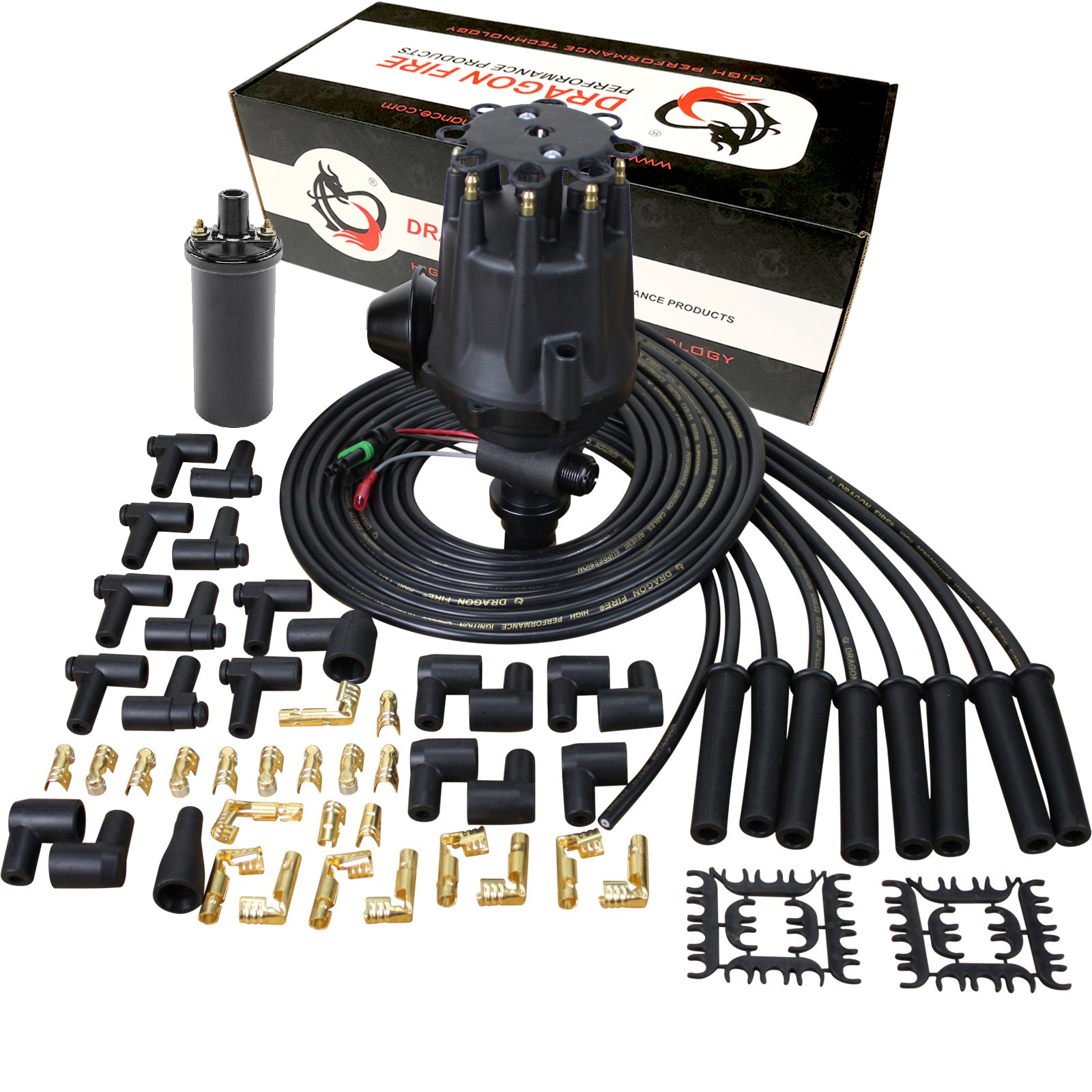 Dragon Fire Performance Pro Series Ready To Run Ignition Distributor Coil and 180° Spark Plug Wire Set For Chevy 327 350 427 454 With Tach Drive V8