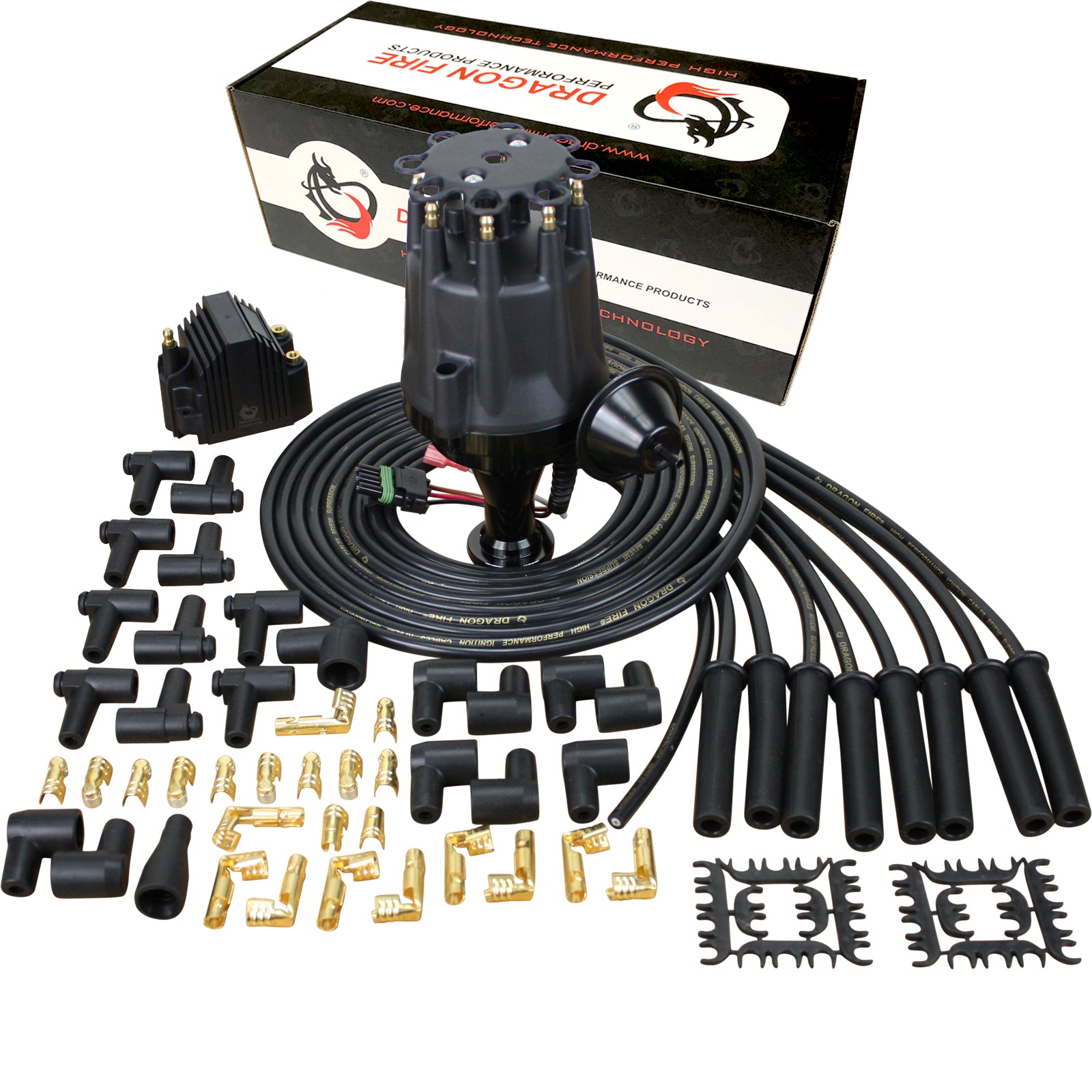 Dragon Fire Performance Pro Series Ready To Run Ignition Distributor Coil and 180° Spark Plug Wire Set For Pontiac 326 350 389 400 421 428 455 V8