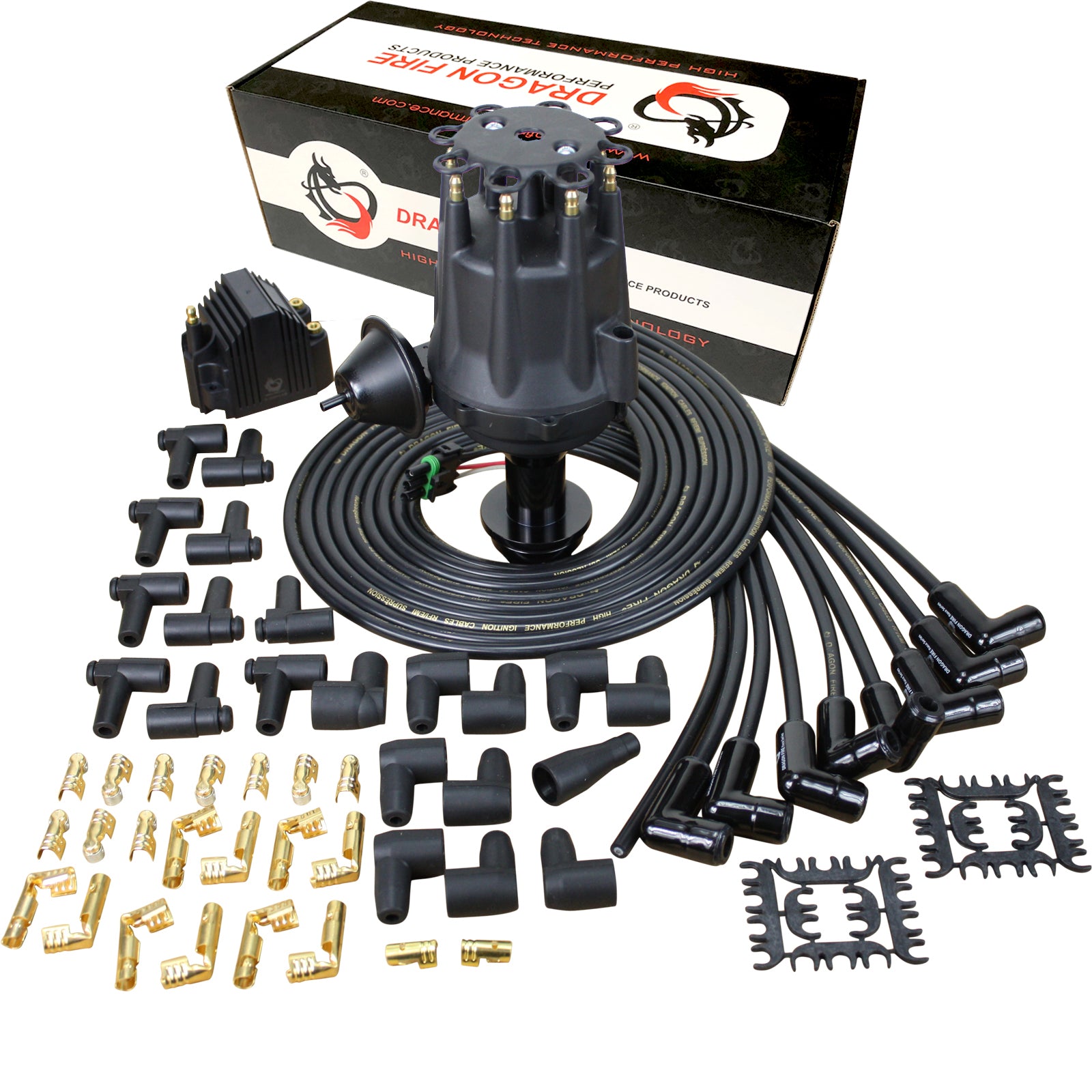 Dragon Fire Performance Pro Series ignition distributor kits are all about durability and performance. Simply the best choice over higher priced ignition systems and cheap Chinese knockoffs. Dragon Fire Performance ignition distributors use only high-quality components to create long-lasting, reliable ignition systems. They allow you to keep the OE look with a small cap and gain all the benefits of an electronic ignition. All Dragon Fire Performance Pro Series ignition distributors utilize a CNC machined aluminum housing for an exact OEM fit and corrosion protection. Distributor features include .50” drive shaft, heavy duty upper bearing, harden steel internals, Dragon Fire Performance electronics, adjustable mechanical advance (bushings included), and Brass terminals. Simple three wire connection to Coil and Chassis Ground (CDI box NOT required) for a quick install. Comes complete with Dragon fire’s high performance 48,000 Volt remount mount ignition coil (peak current of 260 mA) and low Ohm Street Series custom cut-to fit spark plug wire set, featuring a Kevlar® core, low resistance spiral wound alloy conductor, RFI/EMI Suppression, and extra thick silicone and EPDM insulation sleeve for superior protection against voltage leaks and engine heat. Terminals are protected by high-temp ceramic boots to ensure optimal spark delivery and extended service life. Heat Rated to 2000° F and Rated good up to 80,000 Volts. Includes installation guide for an easy DIY install. Making it easier than ever to upgrade your old worn out points distributor to a new performance electronic ignition. *See Fitment Guide and part number to confirm this is the correct part before purchase.*