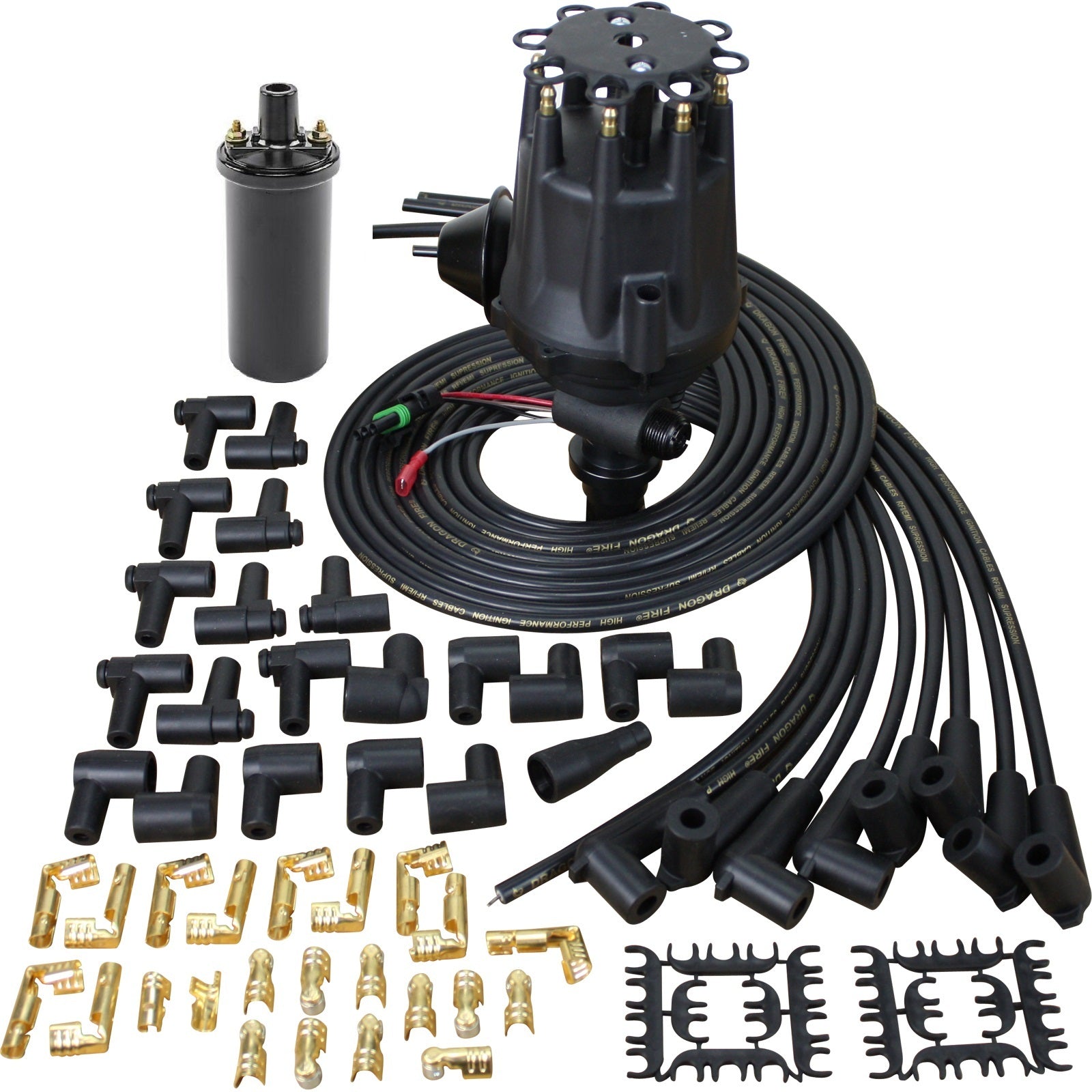 Dragon Fire Performance Pro Series Ready To Run Ignition Distributor Coil and 90° Spark Plug Wire Set For Chevy 327 350 427 454 With Tach Drive V8