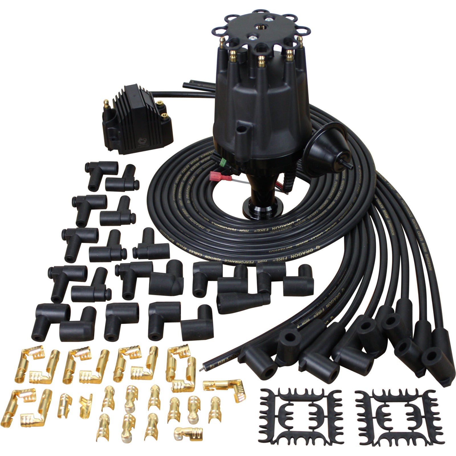 Dragon Fire Performance Pro Series ignition distributor kits are all about durability and performance. Simply the best choice over higher priced ignition systems and cheap Chinese knockoffs. Dragon Fire Performance ignition distributors use only high-quality components to create long-lasting, reliable ignition systems. They allow you to keep the OE look with a small cap and gain all the benefits of an electronic ignition. All Dragon Fire Performance Pro Series ignition distributors utilize a CNC machined aluminum housing for an exact OEM fit and corrosion protection. Distributor features include .50” drive shaft, heavy duty upper bearing, harden steel internals, Dragon Fire Performance electronics, adjustable mechanical advance (bushings included), and Brass terminals. Simple three wire connection to Coil and Chassis Ground (CDI box NOT required) for a quick install. Comes complete with Dragon fire’s high performance 48,000 Volt remount mount ignition coil (peak current of 260 mA) and low Ohm Street Series custom cut-to fit spark plug wire set, featuring a Kevlar® core, low resistance spiral wound alloy conductor, RFI/EMI Suppression, and extra thick silicone and EPDM insulation sleeve for superior protection against voltage leaks and engine heat. Terminals are protected by extra thick high-temp silicone boots to ensure optimal spark delivery and extended service life. Heat Rated to 600° F and Rated good up to 80,000 Volts. Includes installation guide for an easy DIY install. Making it easier than ever to upgrade your old worn out points distributor to a new performance electronic ignition. *See Fitment Guide and part number to confirm this is the correct part before purchase.*