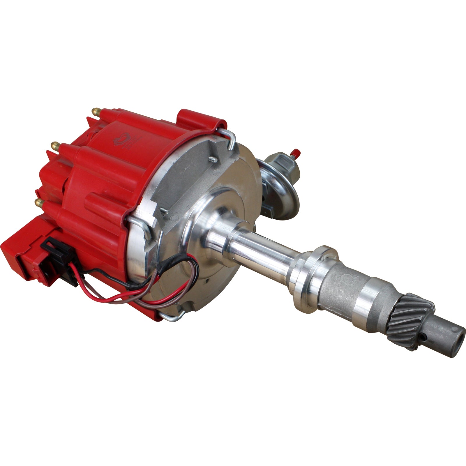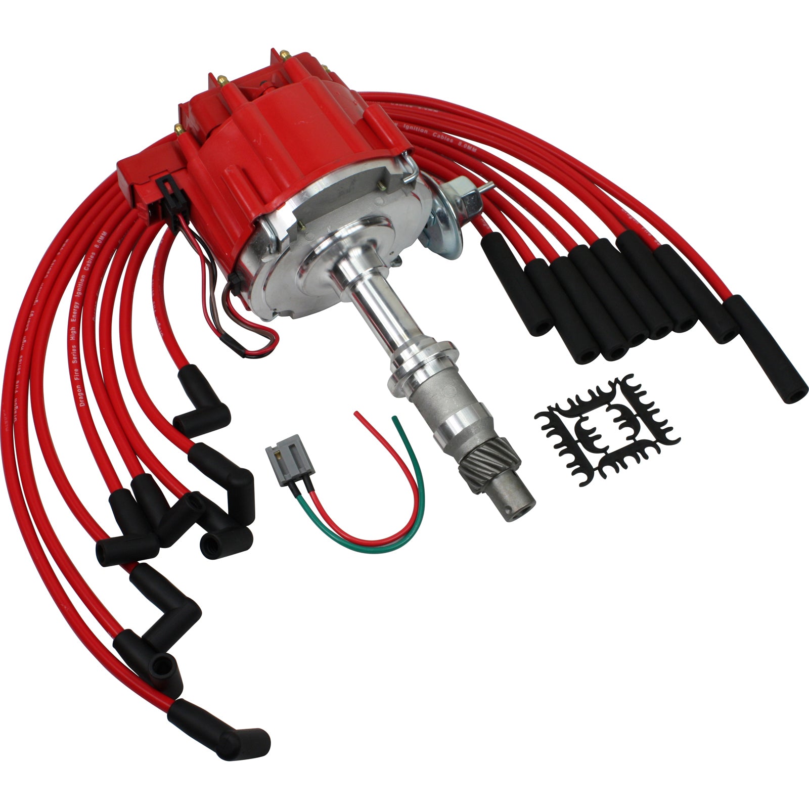 •FEATURES All-in-One HEI design, CNC machined aluminum for exact fit highly durable non-corrosive housings, simple 1-Wire Hook-up, adjustable vacuum and mechanical (extra bushings not included) advance, welded weight pins, hardened steel shaft, Brass terminals, high output 65kV ignition coil, precision molded thermoplastic to resist fracturing and cracking from constant heat cycling, low Ohm spark plug wires, extra tight plug wire boot fitment, all connections are watertight and weatherproof, tested and ensured to match OE fit, only performance grade materials used for long service life.